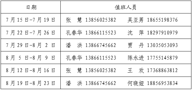 二、暑期安排值班,请各科室根据工作分工和学校重点工作合理安排时间,抓好巡视整改、文件修订、教育教学审核评估、党纪学习教育、对外合作交流等重点工作落实。