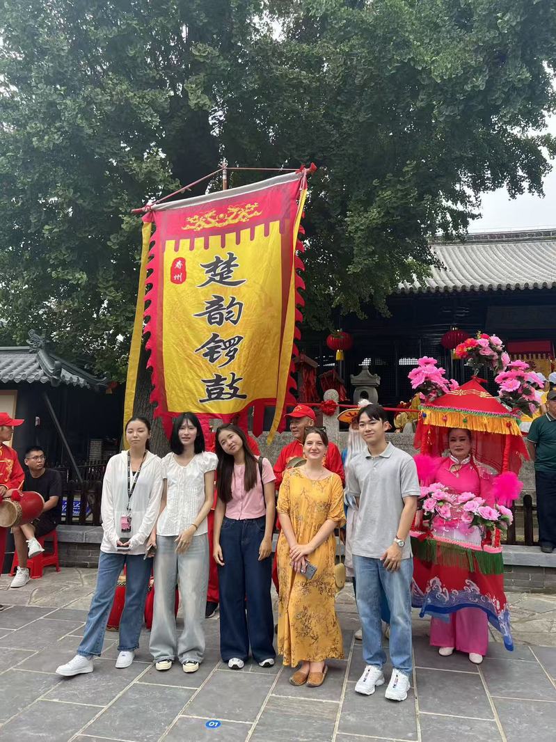 上午,师生们乘车抵达寿县后,便深度融入活动之中。同学们身着汉服,沉浸式参与世界旅游小姐总决赛相关环节,在二十四节气馆见证第二届文创产品设计大赛成果发布,还打卡品尝了特色“寿州豆乳奶茶”。接着,来到寿州孔庙,大家驻足参观,欣赏寿州锣鼓的铿锵、抬阁肘阁的精巧、小车灯与旱船的灵动,并与演员们热情互动。留学生们则与民间艺术家携手,体验剪纸的妙趣与“寿州香草”香包的制作,在一剪一线间感受传统技艺的温度。整场活动中,师生们既沐浴国际文旅盛会的热烈氛围,又亲历传统文化与现代科技的交融,更深切体悟儒家文化与楚文化的深厚底蕴。