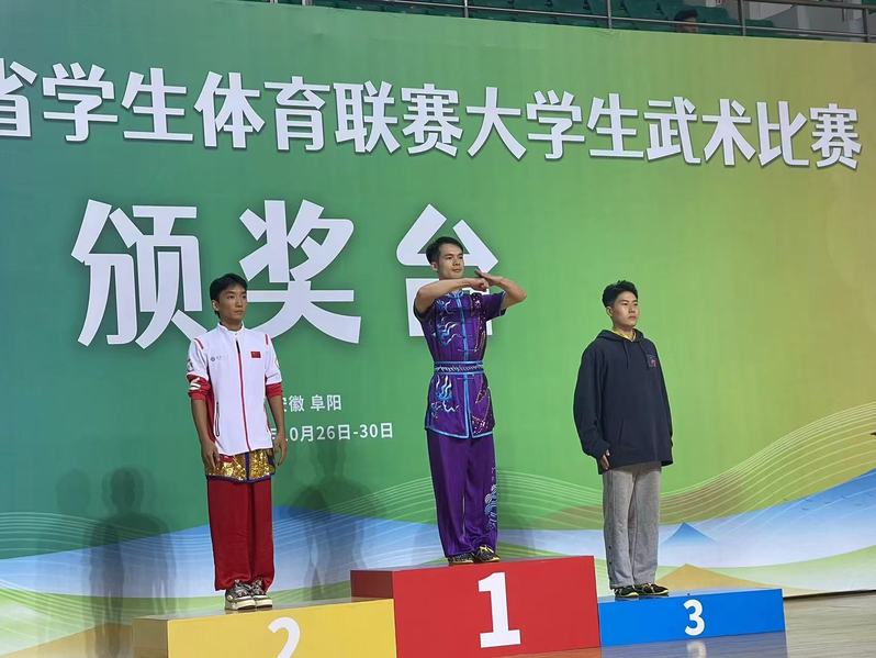 在毛献亮老师的指导下,我校武术代表队参加了刀术、剑术、南拳、对练等7个项目的比赛,取得历史性突破,共收获2金2银2铜以及7个4至8名的优异成绩。其中王星墨荣获男子甲组自选刀术冠军,徐家豪夺得男子甲组剑术冠军,孙晨在男子甲组南拳与南棍项目中分别获得亚军,王星墨获男子甲组棍术季军,徐家豪、孙晨、王星墨三人组成的对练队伍在甲组对练项目中摘得铜牌。