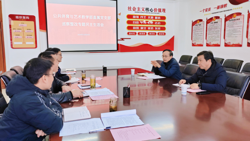 12月20日上午,公共体育与艺术教学部直属党支部召开了巡察整改专题民主生活会。校纪委办公室纪检监察室主任徐成文和党委组织部副部长马保卫到会督导。教学部直属党支部书记许刚,支委霍永海、毛献亮、汪征参加,会议由许刚主持。