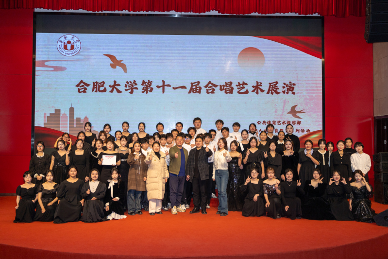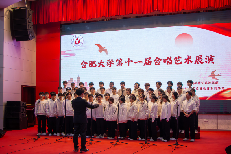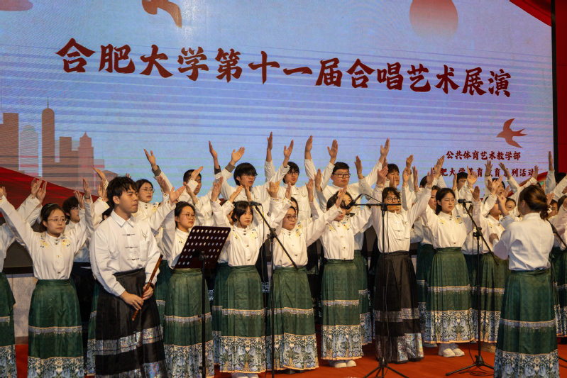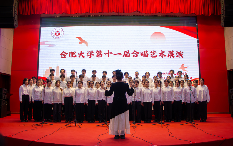 随着《保卫黄河》激昂的旋律响起,合唱展演正式拉开帷幕,瞬间点燃了在场师生澎湃激情。《南泥湾》《小雅·鹿鸣》《这世界那么多人》《追光者》以及《灯火里的中国》等经典歌曲依次上演,生动描绘了中华民族从崛起到富裕再到强大的壮丽历程,赞颂了祖国在政治、经济、科技和文化等诸多领域取得的辉煌成就。活动中,同学们满怀激情地高唱,充分表达了对党和祖国的深厚感情和浓浓祝福,同时也展示了合大学子强烈的集体荣誉感和积极向上的精神风貌。