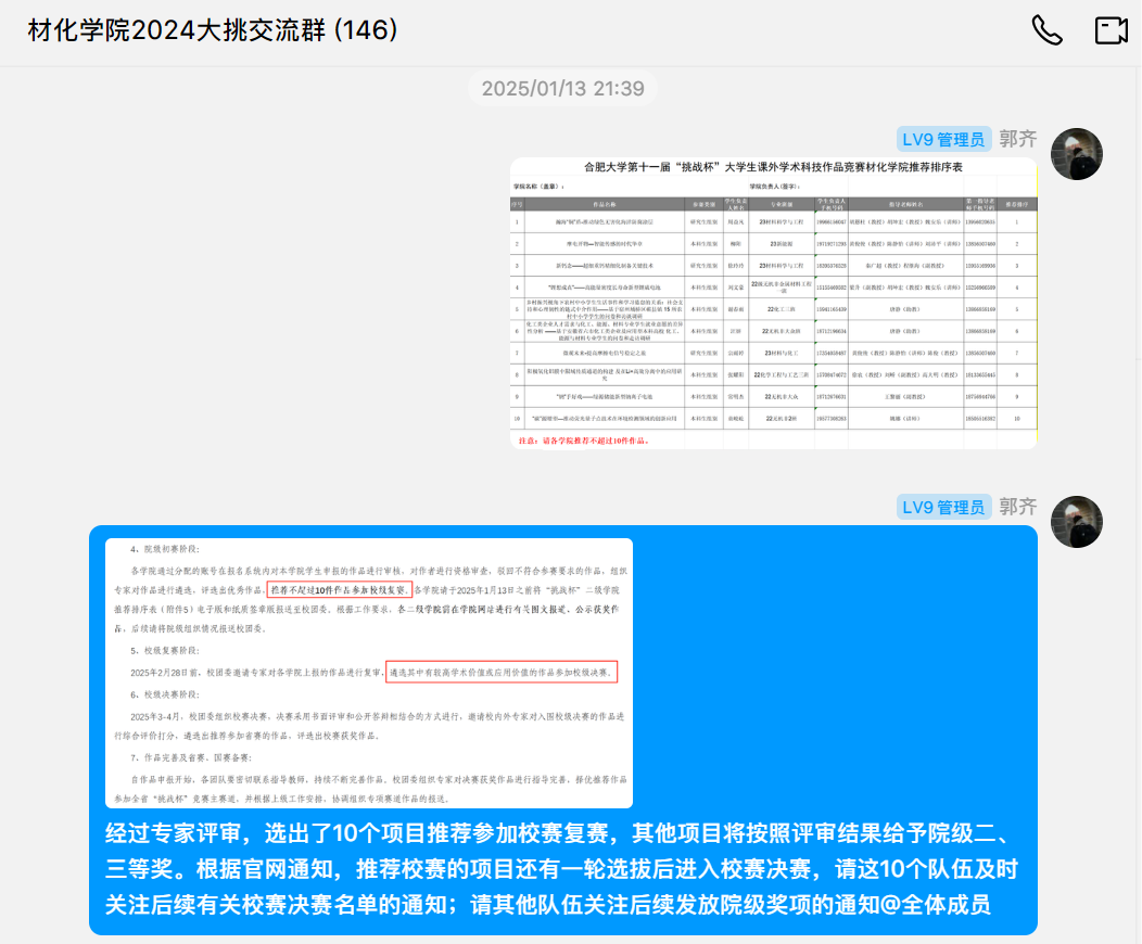 在报名结束后,学院及时组织专家对提交的项目进行评审,并按照校团委的要求,评审出10项质量较高的项目推选校赛。推选结果在本次竞赛的材化院分群中进行了公示,并要求进入校赛的队伍积极打磨备赛。