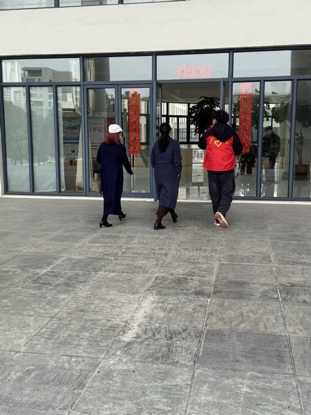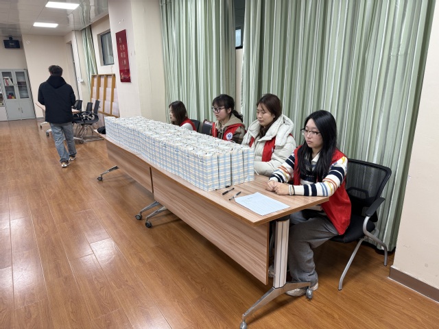 活动当天,志愿者们早早来到学院,在入口、走廊等关键位置引导前来参加活动的人员。他们身着统一的红色志愿者服装,为现场增添了一抹温暖亮色。在会议室中,志愿者们有序摆放礼品,准备活动相关事宜。