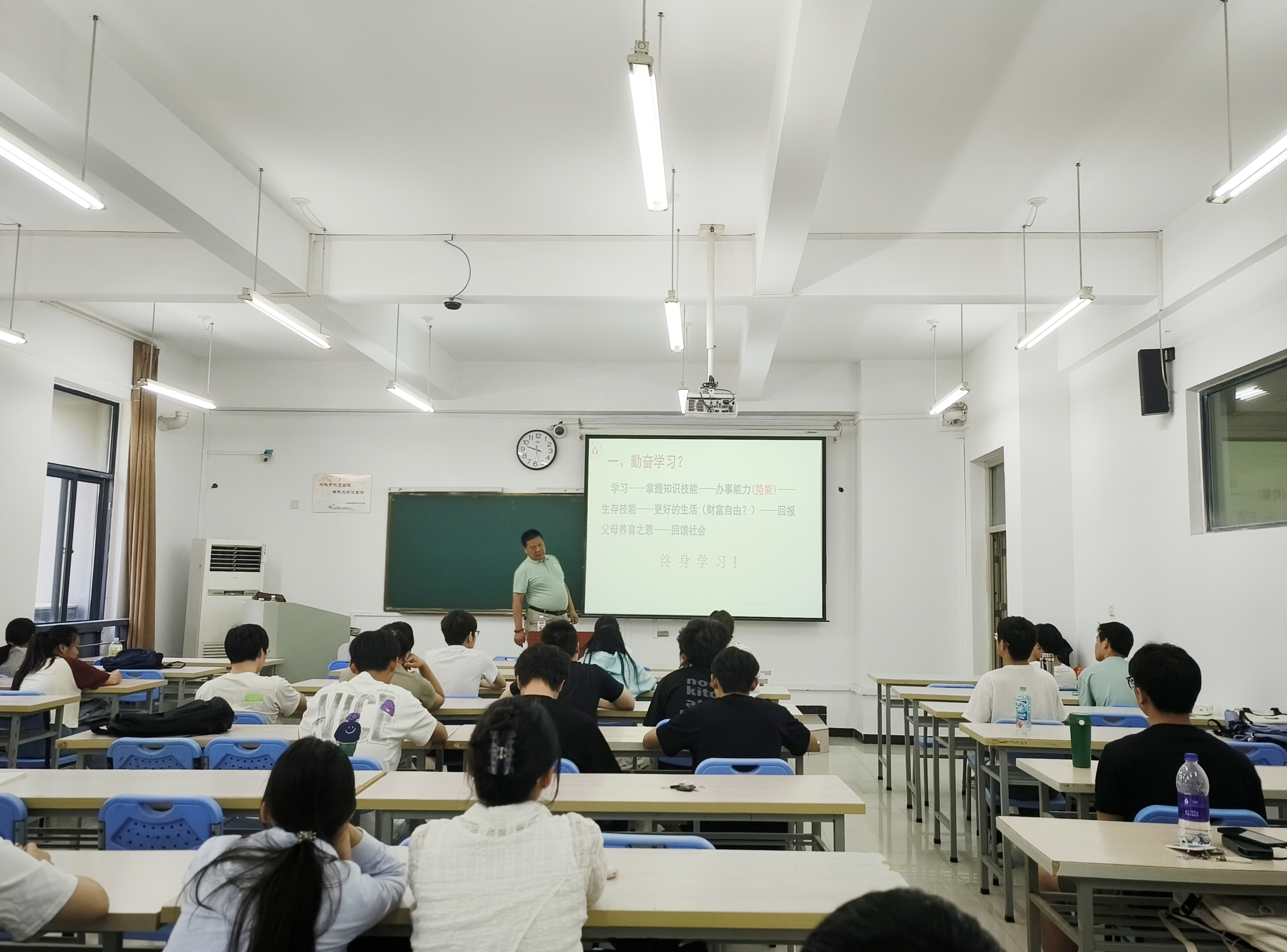 随后,朱老师结合自身丰富的人生经历和深厚的学术造诣,围绕“为什么要学习”“认识自我与调整心态”“踏实做事和学习实践”三个方面展开了深入讲解。朱老师指出,在知识快速更新的时代,终身学习是每个人保持竞争力的关键,只有不断深入学习才能改变自己的命运。他通过分享自己在化工领域多年的研究经历,鼓励学生树立远大的学习目标,不断追求卓越。
