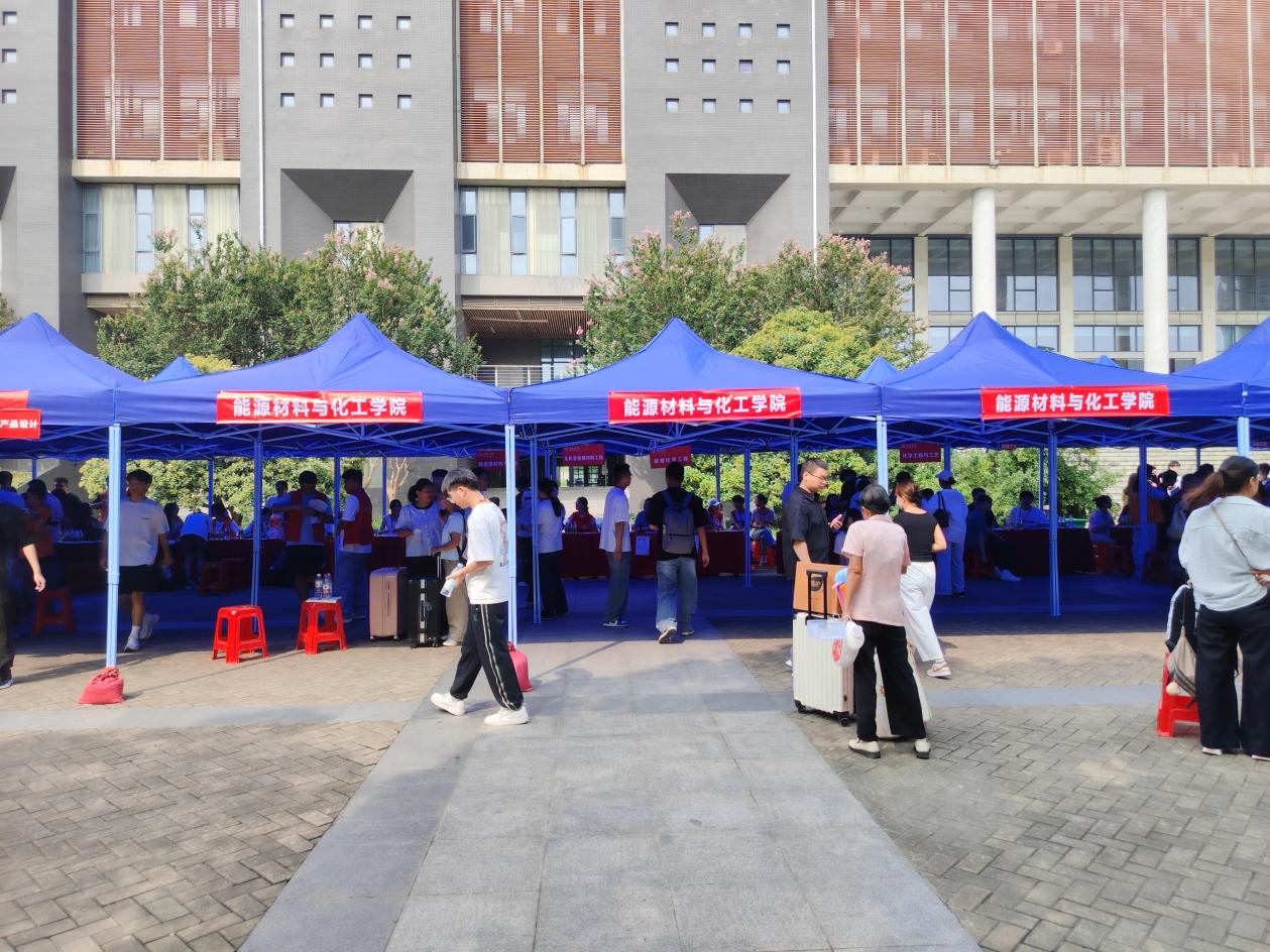 在图书馆门前的能源材料与化工学院迎新处,老师以及志愿者们热情地为新生办理报到手续、答疑解惑,并为每一位新生发放矿泉水,让新生感受到学院的人文关怀。