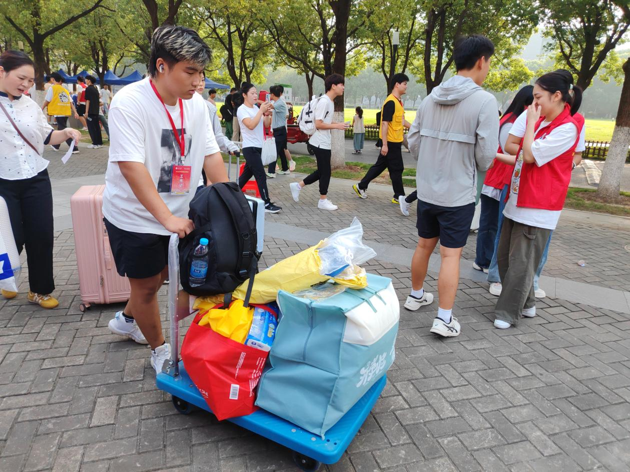 校园里,身着红马甲的志愿者们构成了一道亮丽的风景线。他们或帮新生搬运行李,蓝色小推车在校园里来回穿梭,满载着新生的行囊与希望;或在咨询点为新生及家长指引路线、介绍校园设施。汗水浸湿了他们的衣衫,却丝毫没有减弱他们服务的热情,他们用真诚的笑容和贴心的帮助,让初来乍到的新生感受到了合大的温暖与活力。