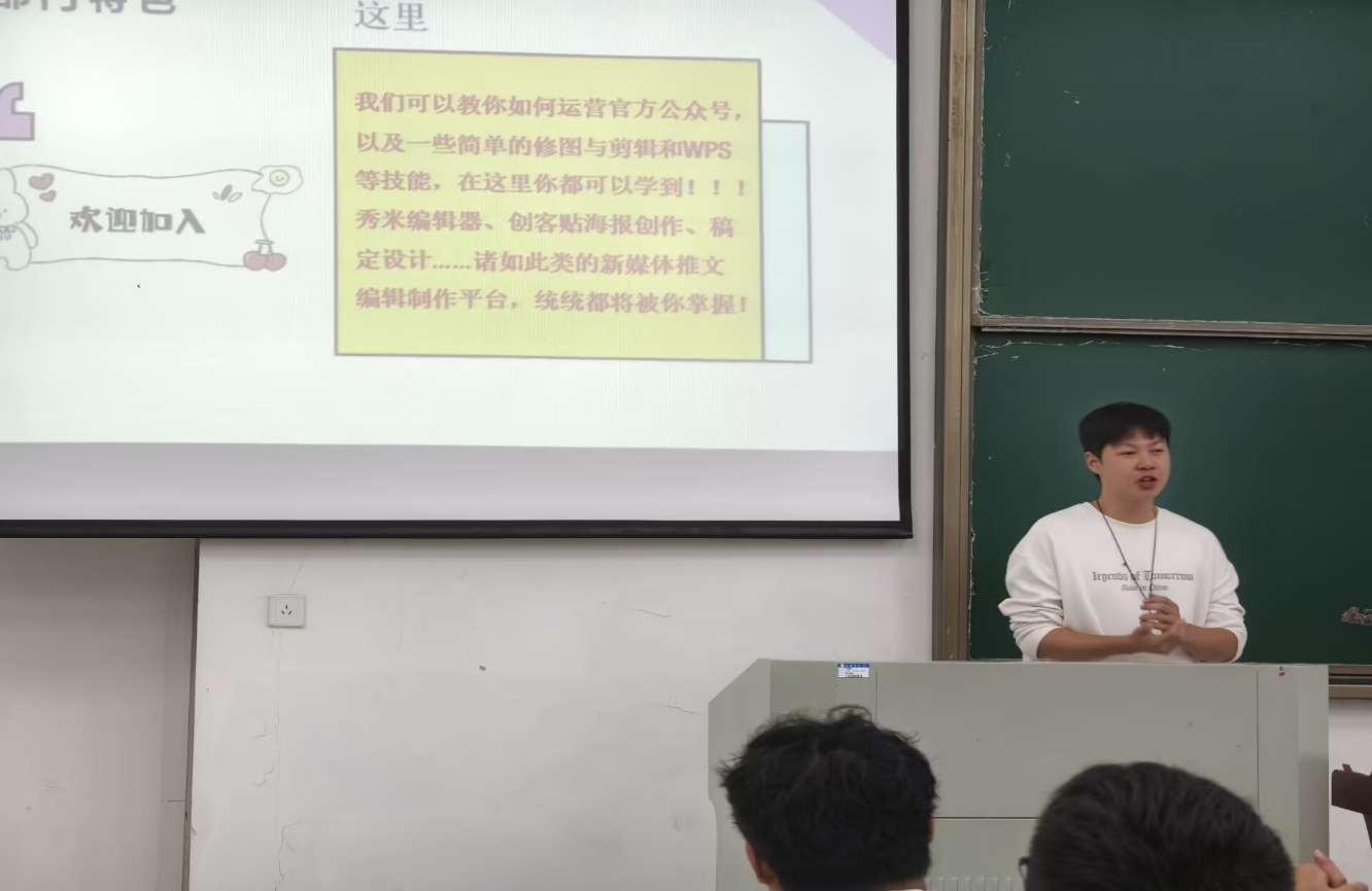老师讲解结束后,各组织依次开展招新介绍:其中新媒体中心作为校园宣传的核心阵地,主要负责官方公众号的日常运营,包括内容策划、文案撰写、图文排版等工作,同时会定期组织技能培训,帮助成员学习简单的PS图片处理、WPS高效办公及视频剪辑技术,无论是对新媒体运营感兴趣,还是希望提升实用技能的学生,都能在此获得实践与成长;文体部聚焦校园文化与体育活动开展,不仅会策划组织运动会、文艺晚会、歌唱比赛、啦啦操比赛、绿模大赛等各类活动,还会选拔学生参与校内外文艺赛事,成员若在比赛中获奖,可按照学校规定获得综测加分,既能丰富课余生活、展现个人特长,也能为学业发展助力。