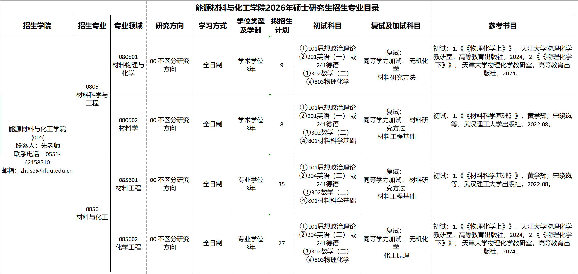 能源材料与化工学院2026年硕士研究生招生专业目录