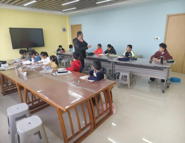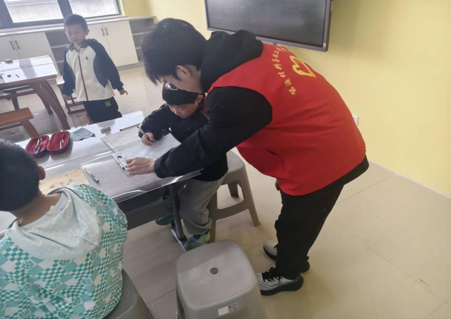 课堂上,志愿者们化身“小老师”,全力配合社区老师开展硬笔书法教学。他们穿梭在孩子们的座位间,仔细观察每一位孩子的握笔姿势、坐姿及书写动作,及时纠正“勾腕”“握笔过紧”“身体歪斜”等问题;针对孩子们书写时遇到的“横画不平”“竖画不直”等笔画难题,志愿者们俯身示范正确写法,手把手指导运笔力度,还用通俗易懂的语言讲解汉字的间架结构与硬笔书写技巧,帮助孩子们理解“横平竖直”的书写要领。同时,志愿者们时刻关注课堂纪律,以温和的提醒引导孩子们保持专注,鼓励大家大胆下笔、相互交流书写心得,让原本略显枯燥的练字过程,变得充满乐趣与成就感。孩子们求知若渴,一笔一划认真临摹,纸张翻动间,中华汉字的形态之美与文化内涵,悄然在孩子们心中扎根。