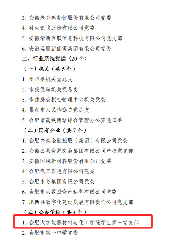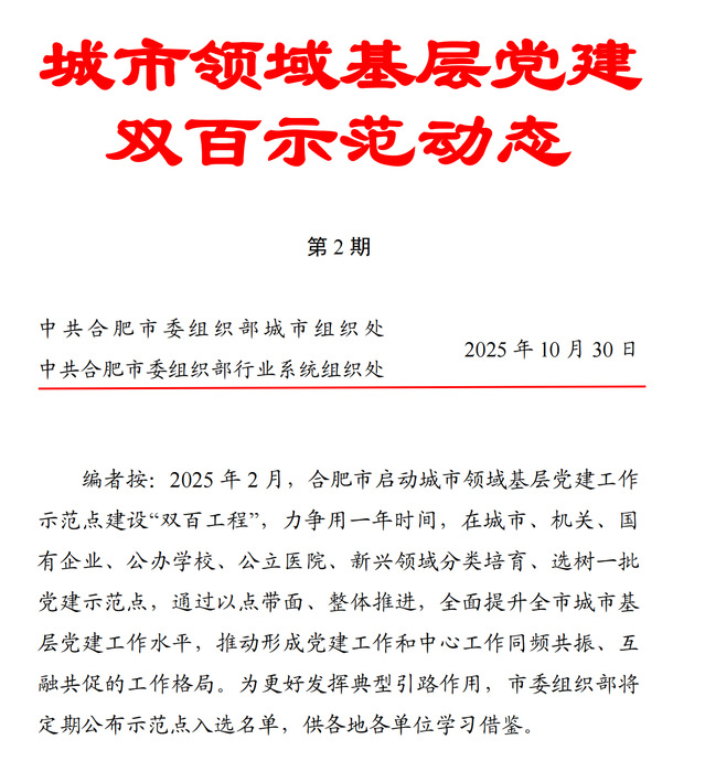2025年第一季度,合肥市启动城市领域基层党建工作示范点建设“双百工程”,力争用一年时间分类培育、选树一批党建示范点,通过以点带面、整体推进,全面提升全市城市基层党建工作水平。经学校党委推荐,能源材料与化工学院第一党支部入选市委组织部城市领域基层党建双百示范点(第批),是全市公办高校唯一入选党支部。