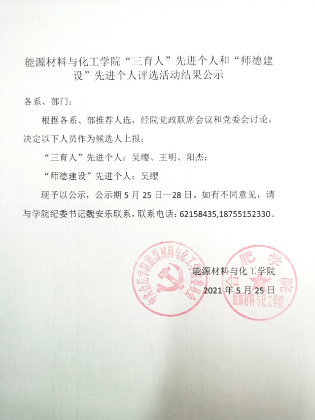 能源材料与化工学院“三育人”先进个人和“师德建设”先进个人评选活动结果公示