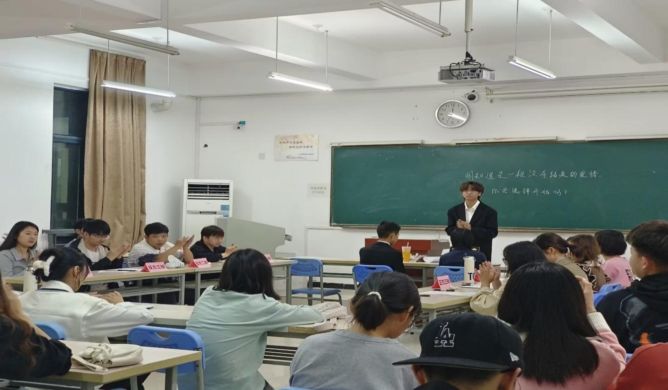 双方就明知道是一段没有结果的爱情,你会选择开始吗?这一辩题开始辩论。比赛开始,双方互相问好。正方台词式的自我介绍给我们留下了深刻的印象。紧接着正方一辩做立论陈词,正方观点为选择开始这段感情,他的陈述简洁且坚定己方观点。紧接着,反方发表他们的立论陈词。一瞬间双方摩擦出了浓浓的火药味,来到第二回合进行一对一攻辩,正方选手举出泰坦尼克号的例子,在资产阶级的压迫下,他们肯定没有好的结果,但是他们还是开始了他们的爱情。并且爱情最后还拯救了rose,让她活成了真正的自己。反方选手也不甘示弱。反驳道,这个爱情到最后rose到底是幸福多还是痛苦多呢?几个回合下来,双方打的有来有回,比赛现场更是令人激动。观众们不自觉地发出阵阵掌声。在最后的嘉宾提问环节里,无论是评委提出的问题还是现场观众提出的问题,我们的选手总能给出满意的答案。在评委们的仔细斟酌下,反方获得本场比赛的胜利,晋级决赛,最佳辩手为反方二辩。