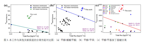 高效分离有机溶剂是化工领域追求的重要目标,而当前有机溶剂的分离主要依赖于高能耗的精馏。在碳达峰、碳中和的“双碳”发展趋势下, 发展低能耗、环境友好的膜分离技术具有十分重要意义。该研究通过聚碳硅烷低温交联制备亚纳米多孔碳化硅膜用于有机溶剂体系分离,并揭示了交联和热解温度对碳化硅膜的孔径和表面性质的影响,气体分离属性液体分离性能相关性(即基于体分离对液体渗透汽化分离性能预测)。实验表明,膜的分离性能达到了该领域的领先水平(图1),具有良好的工业化应用前景。
