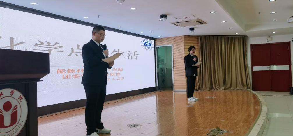 11月20日晚七点整,由能源材料化工学院院学生会科创部主办,院学生会各部门协办的“化学点亮生活”大赛决赛在大学生活动中心报告厅拉开幕。本次比赛由能源材料与化工学院主席团成员王振鑫、彭泽宇、魏嘉琪、朱海涛、张小辉担任评委。