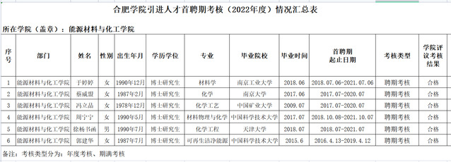 根据个人申报情况,经学院学术委员会审核,院党委会和党政联席会议研究决定,能源材料与化工学院人才引进聘期考核学院评议结果如下: