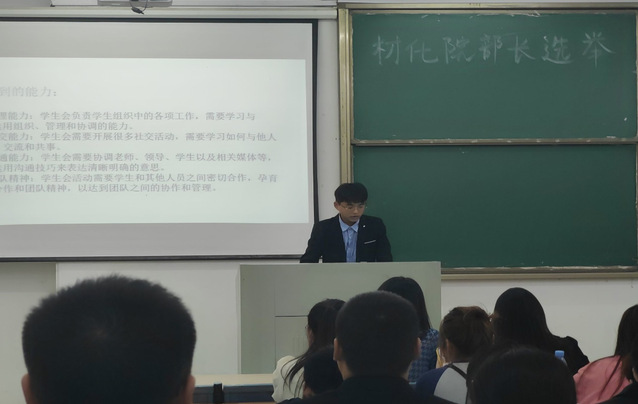 6月11日晚6点半,能源材料与化工学院学生会部长换届大会在生化楼一阶梯顺利召开,出席本次会议的人有院学生主席团成员以及数名竞选同学。