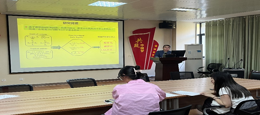 王老师首先从研究背景开始,为大家介绍了离子液体的组成以及离子液体催化不足的解决方法,而后详细论述了这类材料的制备和性能。他强调多孔材料具有孔隙大小和分布的可调控性,因而适用于多种化学反应。同时,这类材料的高稳定性有助于在多种反应条件下提供可靠的催化效果。王老师还介绍了离子液体衍生的多孔催化材料在催化生物柴油制备、清洁能源生产、废水处理、有机合成等多个领域的应用。最后,王老师对报告进行了总结,本院师生和王老师进行了互动交流,报告在全体师生的掌声中落下为帷幕。