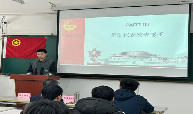 本次团日活动特别安排了新生代表王一湘同学讲话,王一湘同学首先阐述了自己转到我们班的原因,然后对我们描述了他对能源化学工程专业的认识,最后表达了对在新班级学习的憧憬。
