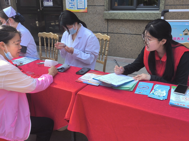 传递健康,关爱守护,为了给小区居民的健康生活提供便利,提高居民健康意识,提升居民健康水平,营造和谐社区气氛,丹霞社区开展了便民义诊,志愿者帮助现场义诊的医护人员登记前来测血压、血糖的居民的信息,在进行测量,并根据测量结果给与相应的健康建议。这项服务不仅能让居民及时了解自己的血压状况,也提高了大家对自身健康的重视程度。
