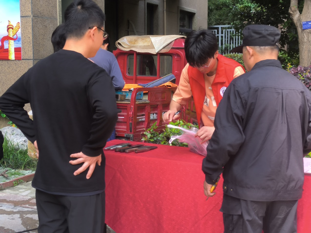 便民服务中的磨刀师傅是最受居民们喜欢,从早上8点半到中午11点师傅一刻都没有停下来,志愿者帮助前来需要磨刀的居民们将刀写上门牌号,以防拿错。辖区居民们一边等着磨刀,一边饶有兴致的讨论磨刀诀窍。