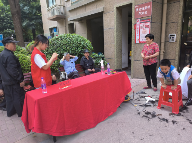 早上8点半,志愿小队准时到达活动场地,在居委会老师的分配下,志愿小队分为了4个部分,分别是便民义诊、便民义剪、便民磨刀和引导小朋友们作画。