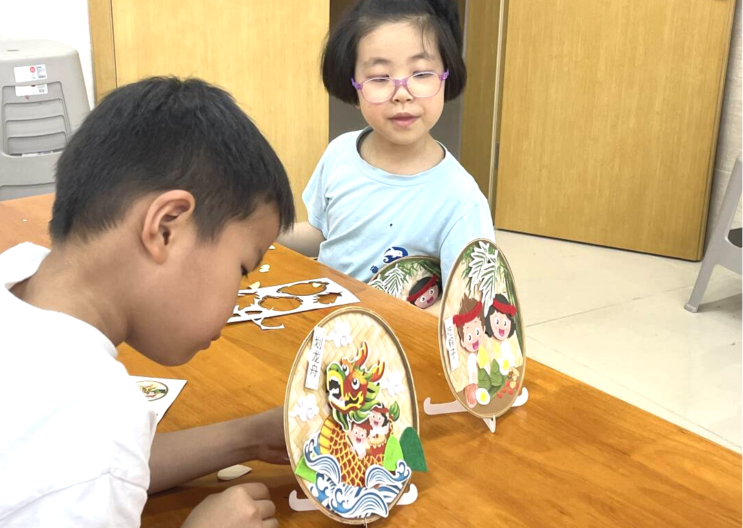 在手工拼贴端午风俗画盘的环节,志愿者们热情地帮助场内的小朋友们,悉心指导每一个步骤,让更多小朋友享受这个手工制作过程。孩子们也在老师和志愿者的带领下,学习着拆分材料、配对贴画、相互合作,每一个动作都充满了对传统文化的好奇和探索。制作完成画盘后,小朋友纷纷展示自己手中的作品,小小的脸蛋上洋溢着灿烂而满足的笑容。同时,每一份制作完成的画盘由小朋友们自己保留,让这一份端午浓情持续蔓延。