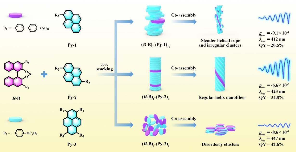 CPL材料的发光行为(例如,发射波长,量子产量以及glum值)调控对其实际应用具有重要意义。迄今为止,针对手性芘基自组装或共组装的CPL发射行为的调控策略主要集中于调节手性诱导剂结构、分子内或分子间相互作用、溶剂效应等因素,而在手性共组装体系中,通过改变非手性芘基发射体的结构对称性来调节CPL发射行为的报道还很少。研究人员精心设计了3种具有不同丁氧基苯取代基数目的非手性芘基有机小分子 (Py-1、Py-2和Py-3)和锚定二面角的手性二苯基诱导剂(R/S-B)构建手性共组装体,并探讨了它们诱导的CPL行为。研究发现,制备的手性共组装体具有多层级CPL发射行为。结构分析和分子动力学模拟表明,(R/S-B)1-(Py-1)10、(R/S-B)1-(Py-2)7和(R/S-B)1-(Py-3)1的多层级CPL发射行为可归因于非手性芘基发射体的结构对称效应导致的不同共组装模式。其中,(R/S-B)1-(Py-2)7的最强CPL发射(|gem| = 5.6×10-2,λem = 423 nm, QY = 34.8%)源于分子间π-π堆叠相互作用驱动下以层状堆积模式形成的高度有序的螺旋状纳米纤维。该研究为通过调控手性共组装体系中非手性芘基发射体的结构对称效应来调节CPL的发射行为提供了新的策略。该工作近期在化学学科知名学术期刊Journal of Colloid and Interface Science发表(doi.org/10.1016/j.jcis.2024.05.019)。