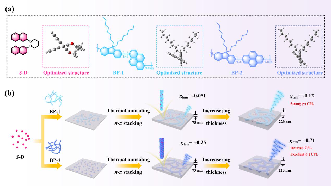 圆偏振发光(CPL)材料在三维成像、光学信息存储、不对称合成等方面颇具应用潜力,在手性科学研究中具有重要意义。手性组分在氢键、静电相互作用及π-π堆积等相互作用的协同下,可以组装成各种各样的手性结构,表现出独特的CPL性质。目前大多数CPL材料的不对称因子(glum)值低于10-2数量级,如何提高glum值以及如何实现手性转移、传递和放大成为当前CPL研究亟需解决的最关键科学问题之一。为解决这一难题,近日,日韩欧美福利视频_黑人巨大人精品欧美三区_欧美成人另类人妖_欧美在线精品一区二区三区_欧美一区二区三区性视频_日韩精品欧美视频_性欧美极品xxxx欧美一区二区能源材料与化工学院青年教师耿中兴及其合作者在高glum值CPL材料的构筑和性能提升研究方面取得了系列新进展。研究人员创新性地采用两种不同取代位点的非手性芘基主链聚合物(BP-1和BP-2) (BP-1的芘环为1,6位,BP-2的芘环为2,7位)作为CPL发射体与一种带有桥接烷基链的手性联萘诱导剂(S/R-D),通过分子间手性诱导机制构建螺旋手性共组装体。有趣的是,与S/R-D-BP-1相比,经过热退火处理的手性共组装体S/R-D-BP-2可以发出反转和放大的CPL信号。最佳质量掺杂比的手性共组装体(S/R-D)0.2-(BP-2)0.8旋涂薄膜的最大|glum|值在220 nm厚度下高达0.71 (λem = 428 nm, QY = 44.8%),约为(S/R-D)0.1-(BP-1)0.9(|glum| = 0.12,λem = 451 nm, QY = 37.6%)的6倍。值得强调的是,在分子间π-π堆叠相互作用驱动的手性共组装芘基CPL材料中,最大|glum|值高达0.71是迄今为止报道的最高值之一。实验和理论分析结果表明反转CPL信号可归因于手性共组装过程中分子间π-π堆叠相互作用驱动的不同共组装模式导致螺旋纳米纤维方向相反。本研究为基于非手性芘基主链聚合物结构-活性调节手性共组装发射体的CPL发射行为提供了一种有效的新方法。该工作近期在高分子学科权威性学术期刊Macromolecules发表(doi.org/10.1021/acs.macromol.4c00153)。