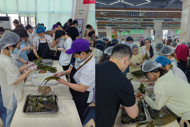 在学生处与后勤集团的联合组织下,“端午粽动员 巧手制安康”包粽子体验活动在第二学生食堂举行。食堂精心准备了粽叶、糯米、肉馅和蜜枣等材料,在师傅的悉心指导下,200多名学生踊跃参与,共包制了2000余个粽子。