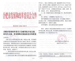 专家公寓、研究生公寓、单身教师公寓经过评审,合肥市发展和改革委员会于2016年10月10日下达批复同意该项目初步设计(发改投资〔2016〕958号)。