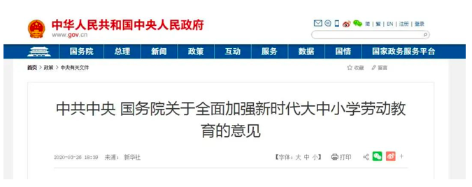 中共中央国务院关于全面加强新时代大中小学劳动教育的意见