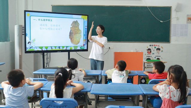 “什么是甲骨文?”课堂伊始,教师首先给同学们讲解了甲骨文诞生的背景和发展历史,“龟甲兽骨文字”是迄今为止中国发现的年代最早的成熟文字系统,是汉字的源头和中华优秀传统文化的根脉。教师旁证博引,用故事和视频带领同学们穿越回商朝,围绕“心”“甘”“齿”“虎”等汉字的甲骨文具体展开讲述。“同学们,大家看这个字,形状像什么?”教师的一句提问,引发了同学们的思考,十几双炯炯有神的眼睛望向黑板,有的认真思索,有的低声讨论,反应迅速的同学已经高高举起右手,抢着发言:“这个甲骨文的‘齿’字就像我们张大的嘴巴,里面还长着几颗牙齿。”