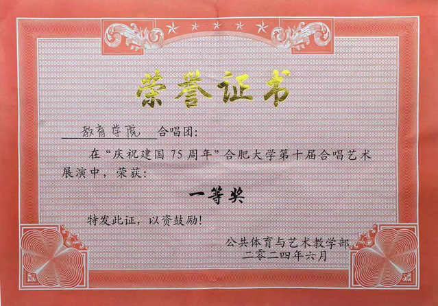 此次获得一等奖不仅是对教育学院合唱团成员们辛勤付出的肯定,也是对他们音乐才华和团队协作精神的赞誉。教育学院将继续支持合唱团的发展,为他们提供更多的资源和平台,让他们在音乐的道路上越走越远,创造更多的辉煌。(教育学院撰稿:罗鑫、彭锦 初审:曹红星 复审:王迅 终审:刘良宏)