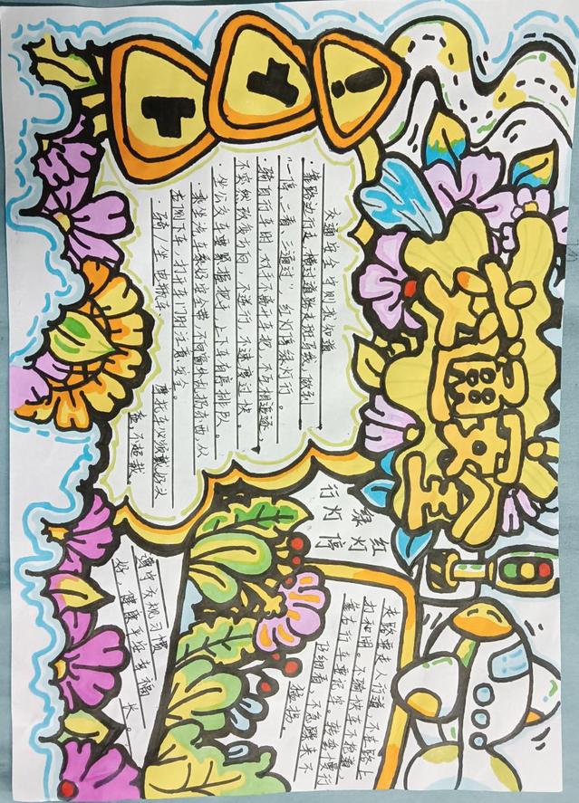 此次活动吸引了学生的积极参与,他们利用课余时间搜集资料,精心设计手抄报内容。同学们的作品不仅版面设计精美,而且主题多样,涵盖了交通信号识别、安全行走规则、骑行和乘车安全等多个方面,充分展示了学生们对交通安全重要性的认识和理解。活动参与者用手中的笔绘出生动的图画、写下有力的文字,呼吁大家学习交通法规,并将其应用到日常生活中,共同营造一个安全、和谐的校园环境。