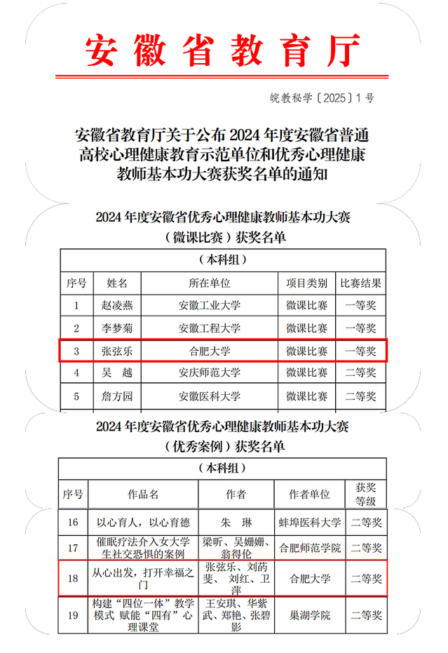 近日,从省教育厅传来消息,我院教师张弦乐在2024 年度安徽省普通高校优秀心理健康教师基本功大赛中荣获本科组微课比赛一等奖、优秀案例竞赛本科组二等奖。