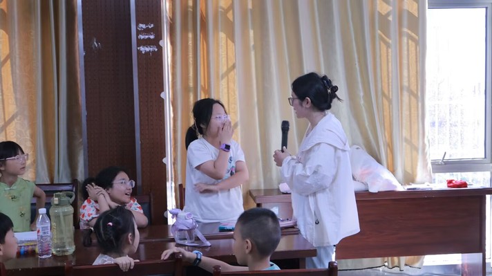 课堂开始前,朱思宇利用趣味热身游戏调动社区儿童的积极性。通过随机抽取一位儿童上台表演和描述“蛋糕”等词语,引导台下儿童进行猜测,营造出轻松愉快的互动氛围,欢快的互动迅速拉近彼此的距离。