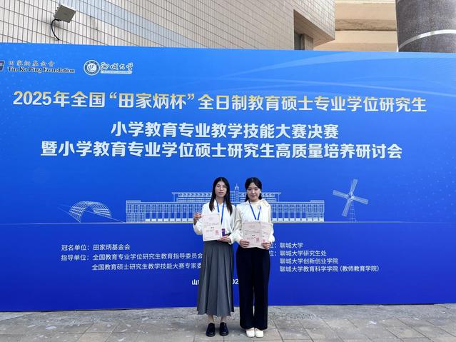 10月24日至26日,全国“田家炳杯”全日制教育硕士专业学位研究生小学教育领域教学技能大赛决赛在聊城大学圆满落幕。经过激烈比拼和精彩展示,我院2023级小学教育方向研究生张培林、朱琴两位同学表现优异,分别斩获2025全国“田家炳杯”全日制教育硕士专业学位研究生小学教育专业教学技能大赛决赛二等奖和三等奖。这是我院研究生首次参与此项全国性高水平教学技能竞赛,她们的成绩充分展现了我院学子卓越的专业素养与教学风采,彰显了学院在研究生培养和教学质量建设方面的显著成效。