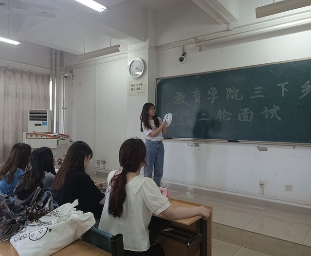 筹备工作火热进行中,志愿精神广泛传播着 ——2021年教育学院三下乡二轮面试 6月22日下午4点,教育学院“三下乡”第二轮面试如期举行。面试当天,工作人员提前到达3栋301教室进行准备工作,组织部部长沈文君、副部长童腾平给委员们分配好写黑板字、签到、现场引导等一系列工作以后,三下乡二轮面试便正式开始了。 同学们顶着炎炎夏日早早地来到了面试现场,在303教室紧张地准备着。二轮面试的内容与一轮面试截然不同,评委们选择了无生课堂的形式,要求志愿者们根据自己的特长爱好选择一门课程进行三分钟的无生授课,以此来考察面试者的专业技能和应变能力。 面试现场,评委们认真记录着面试者的表现,紧张地进行打分工作。有的同学选择的课程是美工,她现场模拟教授孩子们绘制脸谱的过程,并且精心设计了与评委互动的环节;有的同学准备的内容是扎花,她拿出提前准备好的折纸,耐心讲解着制作步骤,一张张白纸被折成了一枝枝花,最终被包扎成了漂亮的花束;有的同学选择唱歌,小老师认真准备了教案,现场展示怎样教授孩子们唱儿歌,一句句耐心地讲解该如何去演唱…… 教育学院的学子们在讲台上大方展现着自己独特的魅力,虽然时间只有短短三分钟,但是志愿者们为我们带来了一场场视觉和听觉上的盛宴!相信这些同学的加入会使“青春向党,育你同行”三下乡实践小队成为一支更加优秀的团队,让我们共同期待二轮面试的结果吧! 在接下来的活动当中,希望教育学院的学子们能够更加积极地投身于志愿服务活动,弘扬志愿服务精神,为国家和社会贡献自己的一份力量。 (教育学院 孙雨淑 童腾平)