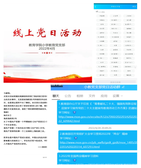 2022428日晚八点,教育学院小学教育党支部组织全体党员通过QQ线上视频开展“持续学习,携手防疫”线上主题党日活动。本次活动由党支部书记王多慈主持,支部党员全员参与。