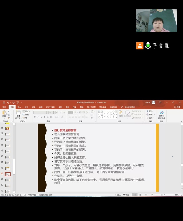 车雪莲老师首先通过三个案例的讲解,给学生展示了智慧型教师的魅力。然后通过智慧型教师的内涵、智慧型教师的成长轨迹、智慧型教师的养成三个层次向学生们介绍了“智慧型教师“,深入阐述了成为一名智慧的教师应及时知晓孩子语言、行为、表情等的深层含义。并告诉同学们幼儿教师教书育人就像建房子打地基一样,前期的理论和技能学习,实践锻炼都十分重要。就如幼儿教师要严格履行教师道德誓言,幼儿教师应通过不断学习、不断反思,给孩子做积极地榜样,为千百个家庭培植希望。