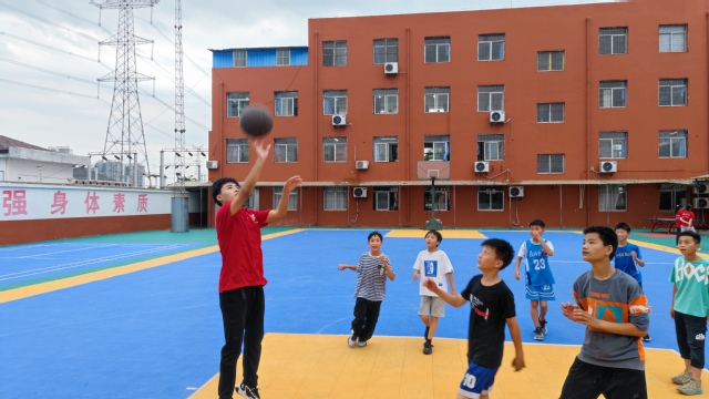 丰富体育内涵,共建阳光校园 合肥学院教育学院暑期三下乡社会实践活动的第二天,为了丰富同学们的课余生活,缓解学业压力,增强体质,服务队的两名志愿者屠厚辉、陈遨地带领蜀山知行学校五年级二班部分同学开展球类活动。 下午最后一节课是五年级二班的室外活动课,结束了一天的炎热,天气开始转凉,同学们运动的欲望大大增加。五年级二班热爱打乒乓球和篮球的同学争先恐后地来到志愿者们日常备课的教室找两位男老师一起打球。同学们手里拿着篮球和乒乓球,簇拥着两位“大朋友”前往操场。两位志愿者根据自己的强项分别和同学们开始不同的运动:一边是屠厚辉带领同学们打乒乓球,另一边则是陈遨地和同学们进行篮球比赛。 行知学校虽然面积不大,但体育运动设施完善,在运动的场地配有篮球架和乒乓球台,还铺有环保无毒的拼装式悬浮地板,不仅具有优良的垂直减震效果,而且防滑的表面还可以有效防止运动损伤。在乒乓球桌前,只见跟志愿者对打的同学慢慢蹲下身子,目视前方,更加用力地握紧手里的拍子,时刻准备迎接对面的发球。尽管同学们还是五年级,但球技与志愿者不遑多让,打得难分胜负。旁边观看的同学目不转睛的盯着空中飞舞的乒乓球,每一个漂亮的切球都引起了他们的喝彩。