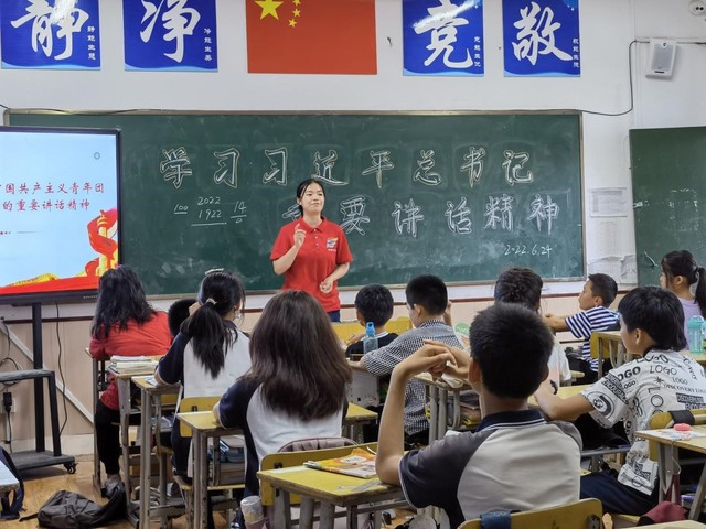 主题班课上,志愿者带领同学们一起学习习近平总书记在中国共产主义青年团成立100周年大会上的重要讲话精神,并不时向同学提出问题,重点对中国共产主义青年团的主要知识点进行了阐述和讲解,中国共产主义青年团是中国共产党领导的先进青年的群团组织,是广大青年在实践中学习中国特色社会主义和共产主义的学校,是中国共产党的助手和后备军。需要年满十四周岁才可入团。随后志愿者又以抢答的方式向同学们提问,作为一名少先队员,对中国少年先锋队的主要内容了解多少?有位同学回答道:中国少年先锋队是中国少年儿童的群团组织,是少年儿童学习中国特色社会主义和共产主义的学校,是建设社会主义和共产主义的预备队。这个完美答案赢得了阵阵掌声。