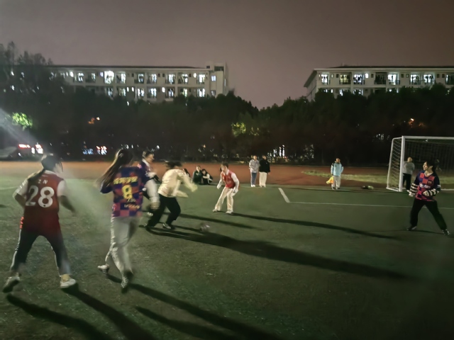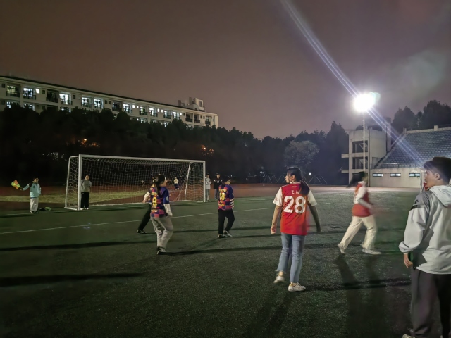 晚八点,随着裁判的一声哨响,双方球员穿着单薄的球衣,但她们都克服了寒冷,在足球场上飞快的奔跑,并且双方每个球员都渴望为队伍拿下第一球,你来我往,互不相让,使赛场的战况十分焦灼。比赛过半,设计学院率先拿下本场比赛一球,但教育学院的球员并不气馁,沉着,并且互相鼓励着,一起布下更为严密的作战计划。赛场上人员的快速移动,我方8号球员张妮,在队友的掩护下,冲破对方的重重阻拦,踢进了教育学院第一球!这一球使得双方比分打平,也使得教育学院球员情绪高昂起来,仿佛驱散了操场的寒冷。上半场临近结束时,教育学院乘胜追击,18号球员方蝶为教育学院再进一球!最终,上半场由2:1的成绩结束。经过短暂的中场休息,球员们互相鼓励着登上球场,观众们也在场下欢呼声不断。