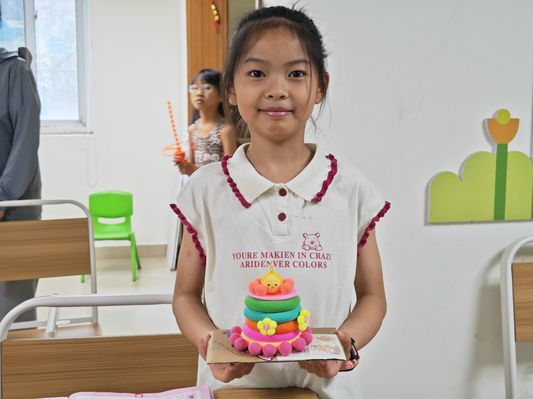 7月5日,合肥学院教育学院“七彩童年,‘育’你相伴”三下乡社会实践团队于合肥市滨湖和园社区开展暑期“三下乡”社会实践活动。团队成员在先前的交流中得知今天是一位小朋友的生日,于是大家决定为她准备一个特别的庆生计划,希望能够给她留下一段美好的回忆。 生日,一直以来被我们赋予别样的意义:从生命旅途的起点到“一岁一礼,一寸欢喜”的仪式感,在我们成长的过程中,总会有那么几次难忘的生日回忆,这些回忆共同构成了我们的珍贵记忆宝库。 团队成员为孩子做的彩色“黏土蛋糕”点缀了这个特别的日子。庆生活动的开始,团队成员朱思宇和周琴就拿出了提前用超轻粘土精心制作好的手工彩色蛋糕。在成员出色技艺下,这个蛋糕被制作得更为精致巧妙。她们还别出心裁地在蛋糕的最上方捏了一个小朋友喜欢的“蛋仔”玩偶,使得整个粘土蛋糕看起来更加灵动且充满了人情味。