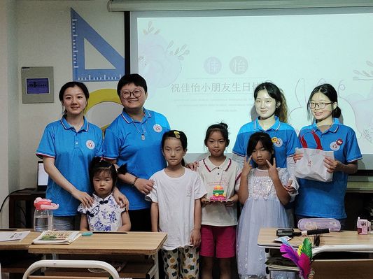 按下的快门合照也折射出孩子们五彩斑斓的记忆。团队成员王欣悦放映了她为小朋友制作的生日祝福幻灯片,并且和在场的其他成员一起带领着小朋友共同为沈佳怡歌唱《祝你生日快乐》。教室温馨的氛围在音符的跳动中更是添上了一抹活跃的色彩。团队成员还为佳怡小朋友送上了小零食,表达了真挚的祝福,希望她能够健康快乐地成长。活动的最后,志愿者们与小朋友一同合影留念,记录下这个美好的瞬间。