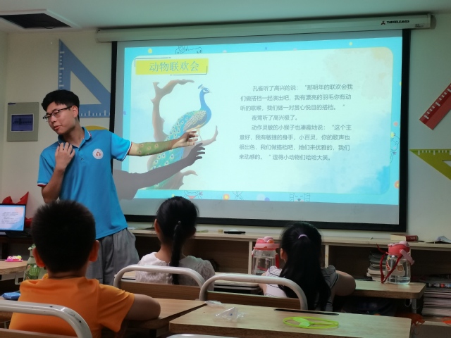 课堂伊始,田老师使用手语操引入课程,借此引发学生对手语歌的歌词与动作的思考。当歌曲《你真的很不错》响起,同学们就模仿老师的动作开始做起手语操。在欢快激昂的音乐声中,大家对彼此竖起大拇指,大声说道“你是真的、真的、真的很不错!”歌声将歇,同学们还久久沉浸在愉悦的氛围中。随后,田老师给同学们讲了一个充满童趣的故事——《动物联欢会》,故事中,孔雀与夜莺相互欣赏、彼此赞美。歌曲与故事互相映证,让同学们更深入地理解“每个人都有自己的特色,人们在相处交往时就像在照镜子,你欣赏别人,别人也就会欣赏你”这一课程主题。