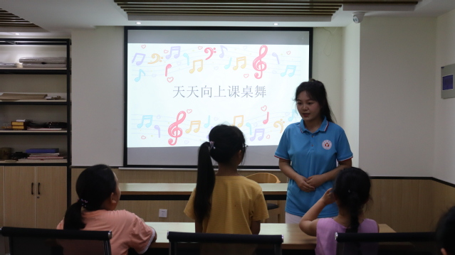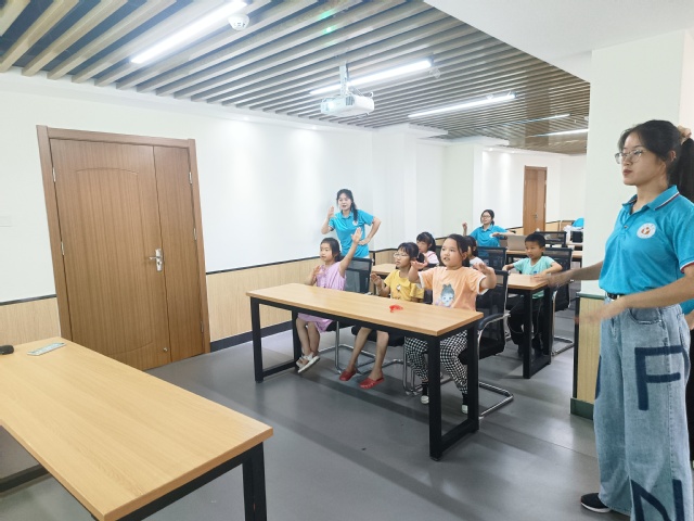 每天都是一个出发点,每天都有一点前进,每天都有一点收获。天天向上的精神是我们成长道路上的不竭动力,让我们永远朝气蓬勃。7月8日,合肥学院教育学院三下乡“七彩童年,‘育’你相伴”社会实践团队成员张晓洁、尹冰清带领滨湖和园社区的孩子们一起学习了《天天向上》手势舞,帮助孩子们在增强音乐节奏感的同时,提高肢体协调能力,让孩子们在新的一天活力满满,奋发向上。 手势舞是一种流行的舞蹈形式,它可以锻炼孩子们的反应能力和灵敏程度,志愿者用多个小游戏来考验孩子们的反应能力。“同学们我们一起来玩正话反说的游戏好不好!”听到志愿者张晓洁的话语,孩子们在教室里炸开了锅,“老师,我喜欢玩游戏,我要玩。”有的孩子虽然不能按照游戏规则将老师所念字句依照反向顺序迅速正确地念出,但这并不能消磨孩子们的热情反而使他们越挫越勇,尽管志愿者准备的词句已经全部用完,孩子们却不愿停止游戏环节。孩子们自信地举起自己的小手,用坚定的声音一次次地说出自己的心中的回答,从不害怕说错答案,反而越来越积极。