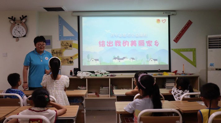 是谁打翻了调色盘,用色彩点缀我们的家乡?又是谁还记得家乡的颜色?在志愿者的引导下,孩子们看着课桌上丰富的颜料,已经开始为家乡着色。家乡的春天是万物复苏的绿色,家乡的夏天是熊熊燃烧的红色,家乡的秋天是硕果累累的黄色,家乡的冬天是纯洁无瑕的白色。有的孩子说,黄色是大地的颜色,蓝色是天空的颜色。“老师老师,还有黑色,黑色是漆黑的夜晚。”“老师,夜晚不是漆黑的,还有白色,那是星星”…… 家乡不仅赋予我们生命,更给予我们快乐。教室又安静了下来,孩子们纷纷拿起手边的画笔,认真地画出自己心中家乡的模样。志愿者们不时走到孩子们的身边鼓励并引导着他们用生动的线条、鲜明艳丽的颜色描绘出心中最美的家乡。“这是我在淮南的老家,是小平房,我一定要画我的老家,因为我想念我的家乡。”一位孩子分享自己的画作时说到。