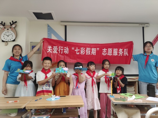 荷花的花语是极其美好的,它代表着清白、纯洁、坚贞、信仰、忠贞和爱情,所谓“出淤泥而不染,濯清涟而不妖”,在开放的时候颜色美丽却不媚俗。志愿者老师拿出准备好的手工材料,让孩子们画出自己心中莲的形象。各种形状和颜色的纸张、彩笔、粘胶、剪刀等在孩子们的手中被创造着。学生们两人一组,兴奋地聚在一起,交流着自己心中的想法,剪刀像燕子一样在卡纸中穿梭着,他们齐心协力,完成了风格迥异的“莲”。孩子们开心地笑着、分享着,整个课堂弥漫着朝气与活力。每个人的作品都独一无二,展示出他们个性和创造力的风采。
