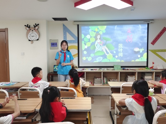 江南可采莲,莲叶何田田……”一首《江南》回响在教室每个角落。你们喜欢荷花吗?”志愿者看着孩子们求知若渴的眼神问道。孩子们高高地举起小手,争着抢着回答,我喜欢荷花,我觉得荷花很漂亮!”“我也喜欢,我听奶奶说,荷花全身皆宝,藕和莲子能食用,很美味呢!趁着孩子们对荷花十分感兴趣,志愿者老师为孩子们播放了《一颗莲子的生命旅程》,一颗莲子入泥后,发芽、长出、长大、盛开......成熟后的新莲子随水漂走、再次入泥。小朋友们发出阵阵惊叹,“原来是这样长大的呀!”荷叶五寸荷花娇,贴波不碍画船摇;相到薰风四五月,也能遮却美人腰。古往今来,文人墨客写过赞美荷花的诗词歌赋数不胜数。荷花生长在污泥之中,出淤泥而不染,冰清玉洁,而且中通外直,不蔓不枝,有着高尚、纯洁、谦虚、坚贞、圣洁和高雅的品质,荷花在孩子们心中有着更美好的形象。